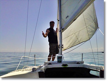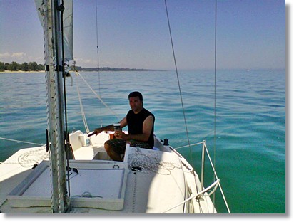 Ok... time for our Maiden Voyage! Here we launched her in at Port Sanilac, MI. I was relieved to see that she floats! That's my buddy Todd in the photo. He's been sailing all his life, and I was happy he was with me for this sail. You can see that I have a trolling motor mounted on the back to get us in and out of the harbor. ![]() Not a lot of wind, but just right for a Maiden Voyage for me! Everything went smoothly with the exception of the open keel hole in the cockpit floor. Cold Lake Huron water occasionally splashed up and hit our feet. I have since made a cover for the keel hole to take care of that. Also the swing keel pivot bolt leaks a little, but nothing I'm going to worry about. That's me in the pics below enjoying my "new" sailboat!